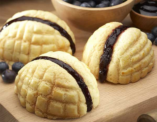 kelembutan roti ini yang diberi selai bluberry yang nikmat dengan taburan kacang, coklat, atau keju diatasnya yang tidak hanya memiliki penampilan yang cantik tapi juga rasa yang nikmat